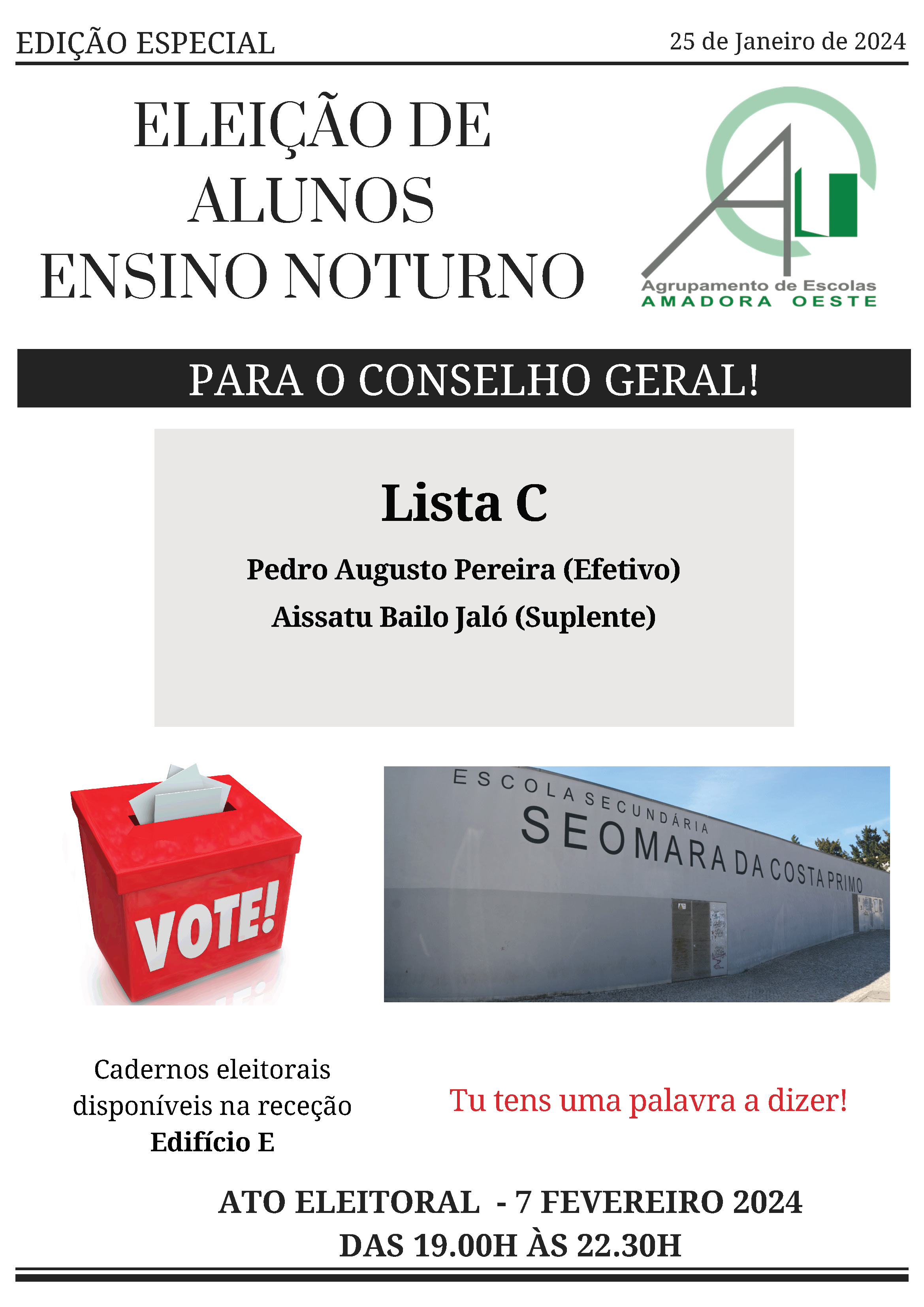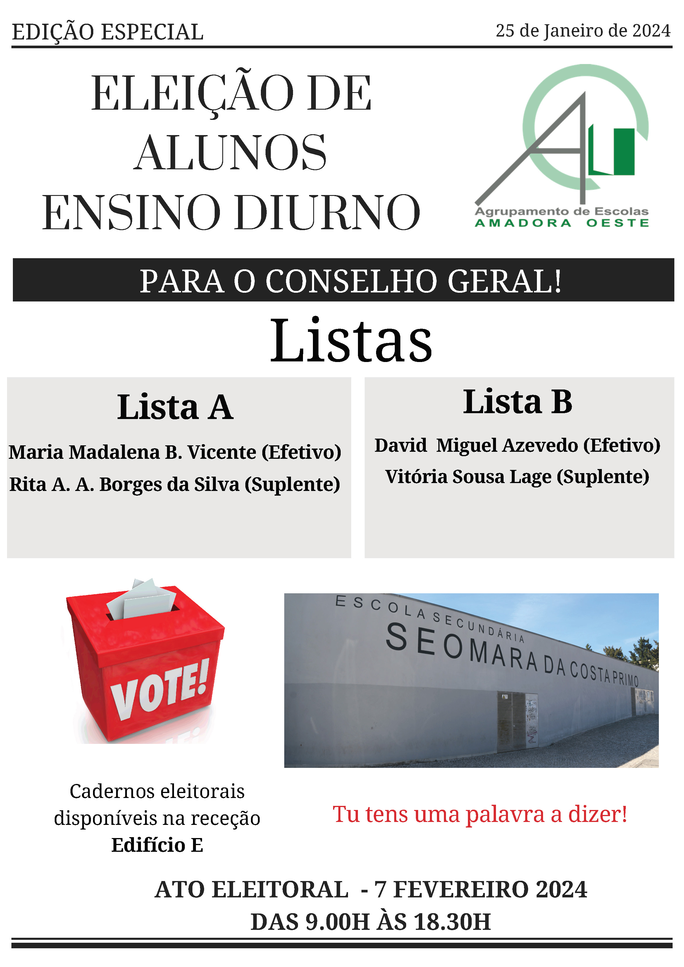Está a decorrer presentemente o processo eleitoral relativo à eleição do representante dos alunos do ensino diurno no Conselho Geral do Agrupamento de Escolas Amadora Oeste.