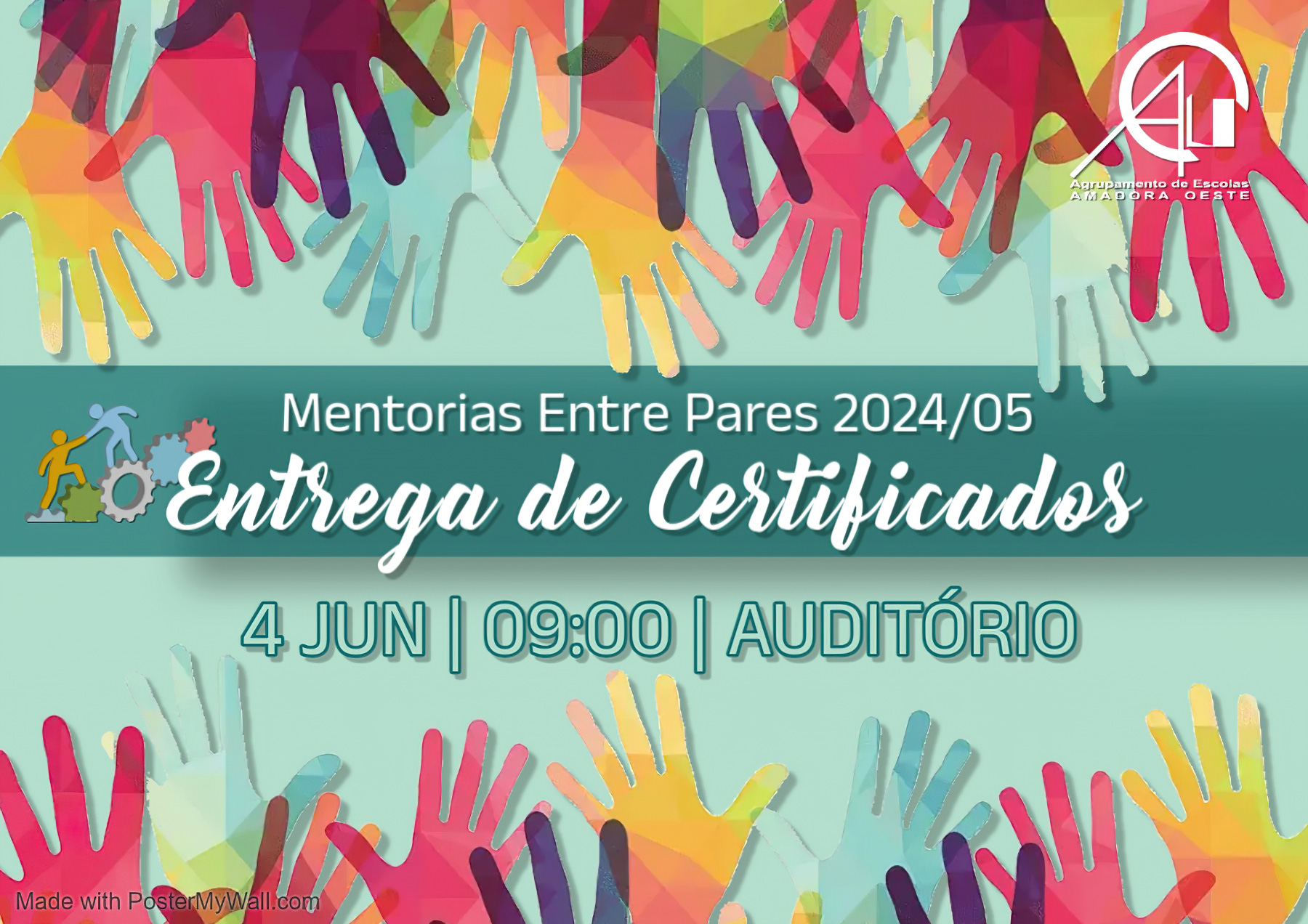 Amanhã, dia 15 de junho, pelas 14:20 h, no Auditório da escola sede, será feita a entrega dos certificados aos alunos que participaram no Programa de Mentorias. Agradecemos desde já a todos os que voluntariamente se disponibilizaram para apoiar os seus colegas!