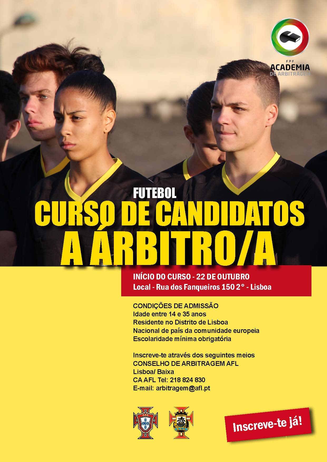 Terá inicio na próxima segunda-feira, dia 22 de outubro, mais um Curso para Candidatos a Árbitro da variante de Futebol podendo os interessados que se enquadrem nas condições de admissão proceder à inscrição provisória, bastando para o efeito que nos devolvam, por esta mesma via, o impresso que anexamos, devidamente preenchido.